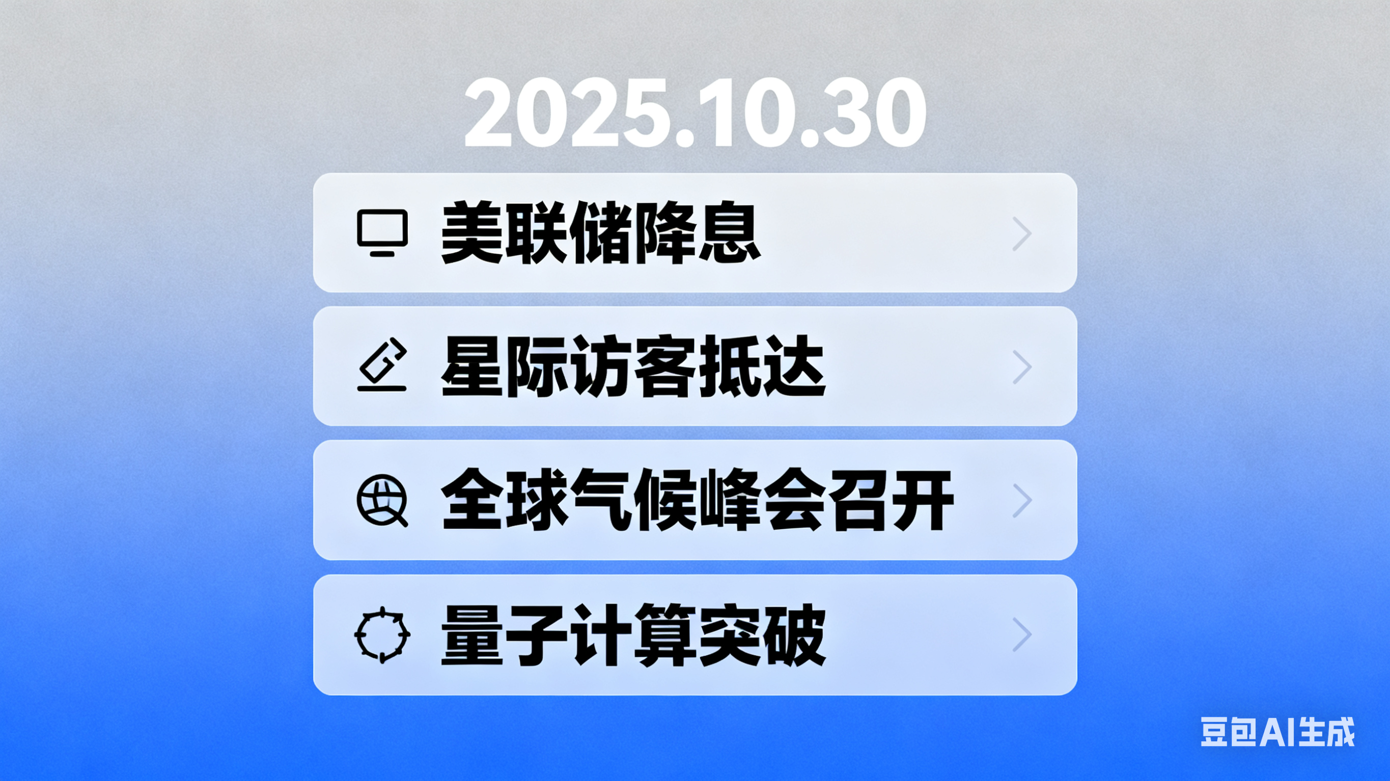 1. 美联储宣布降息25基点:北京时间30日凌晨,美联储宣布降息25基点,利率区间降至3.75%-4.00%。鲍威尔表示,持续的政府“停摆”已干扰经济数据发布,将对经济活动产生实质影响。